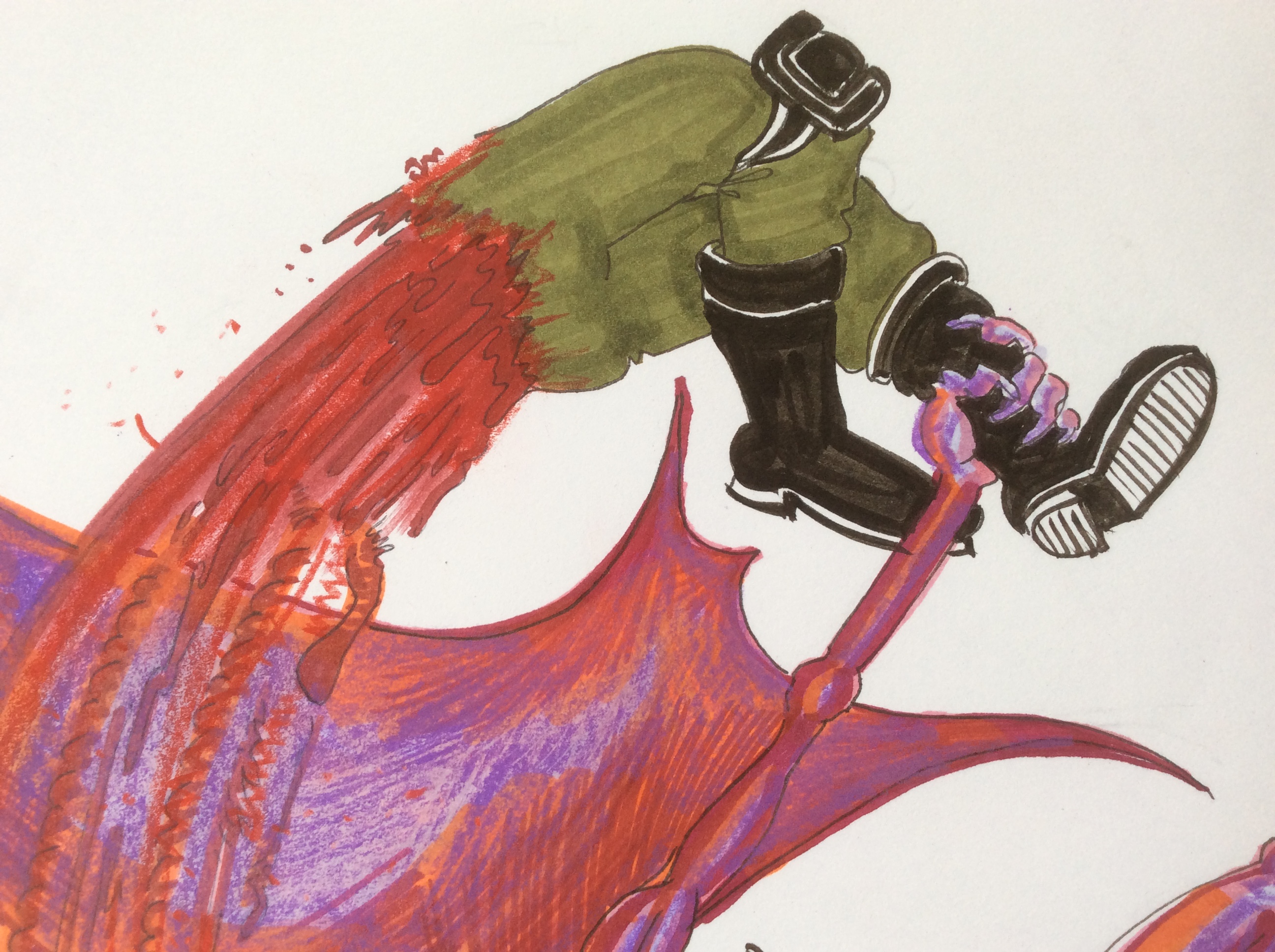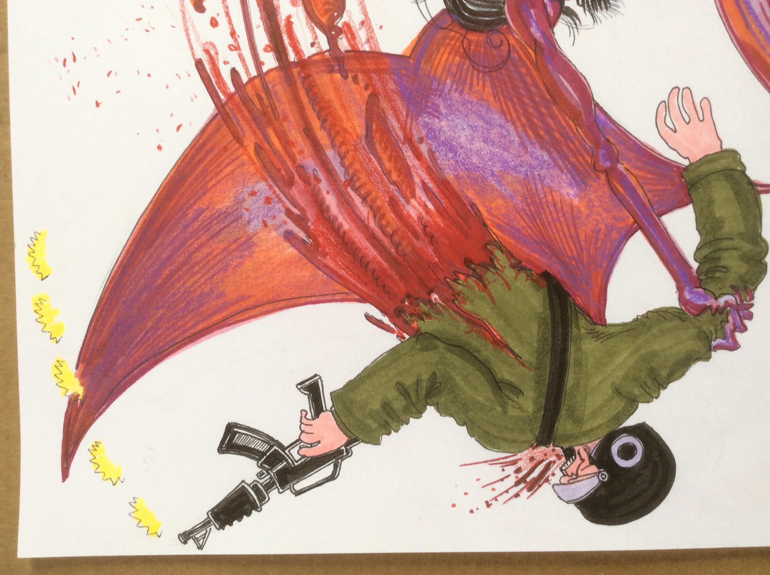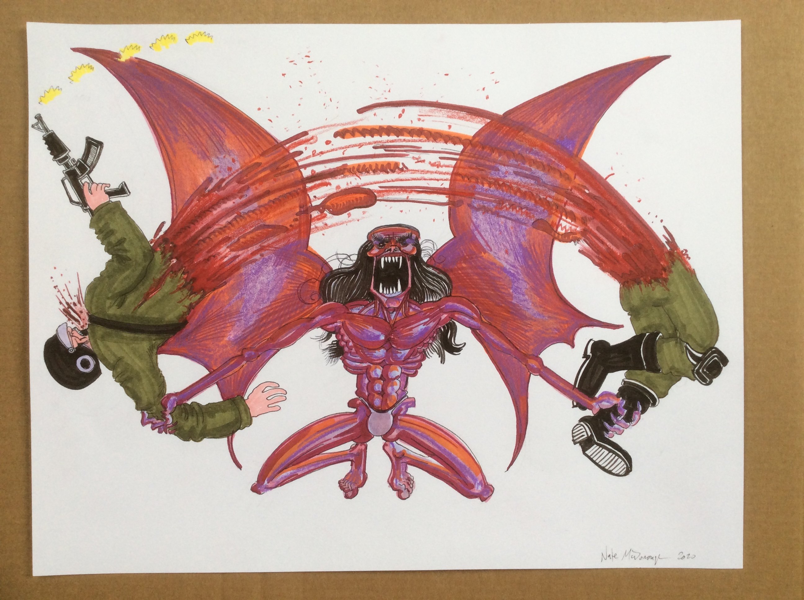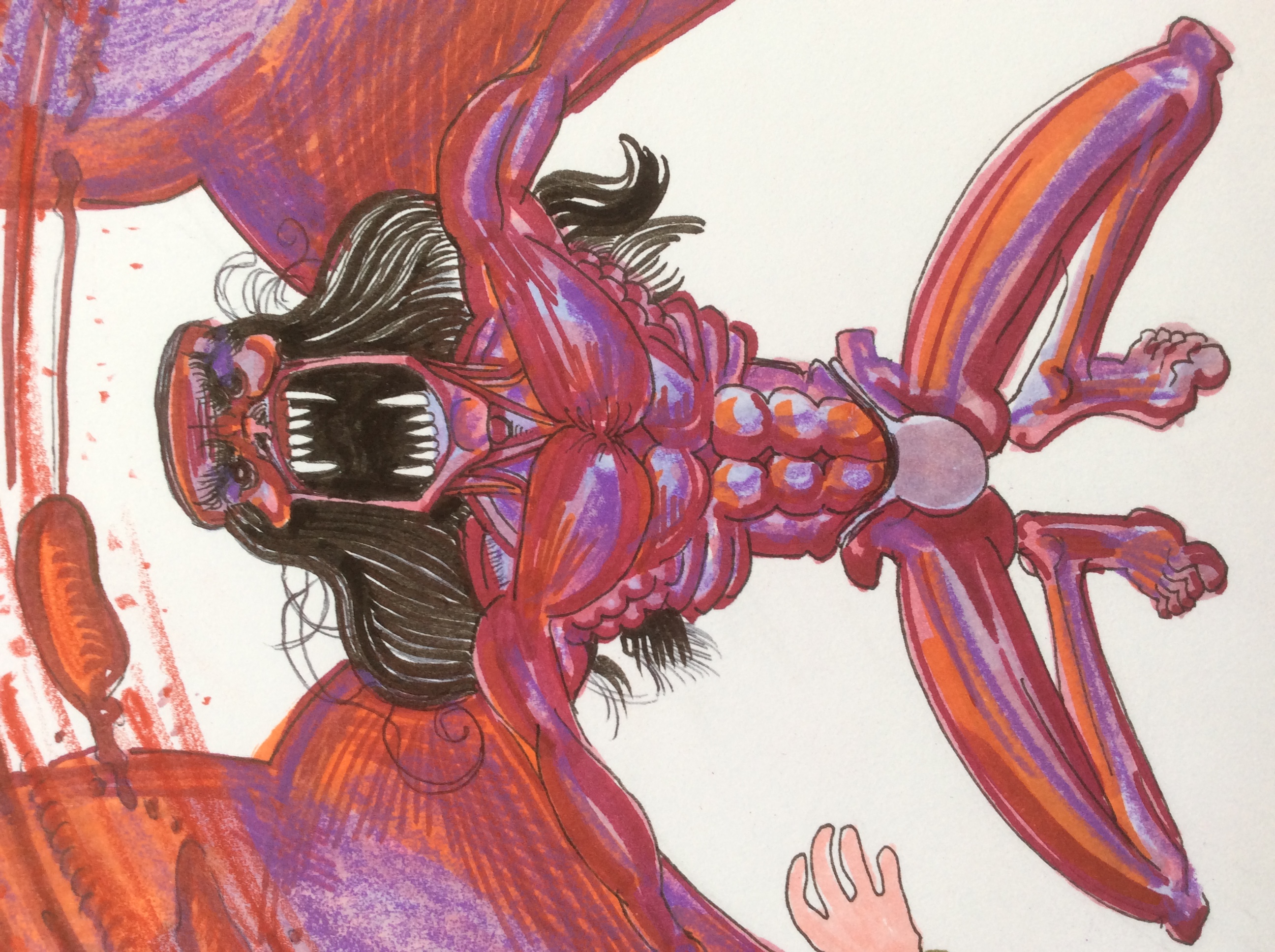 11 x 8.5 original multimedia on Bristol board, naked lavender space vampire tearing a guy in half